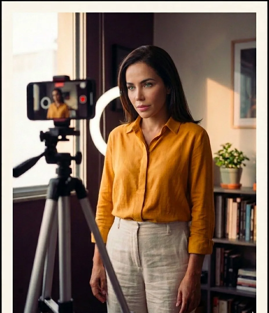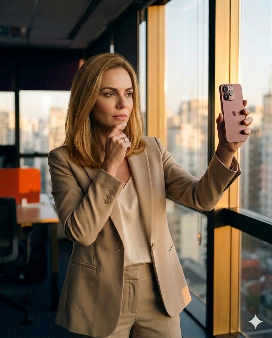 Você ajusta olhar, respiração, postura e ocupação de espaço diante da câmera. O mesmo rosto começa a transmitir uma autoridade diferente.